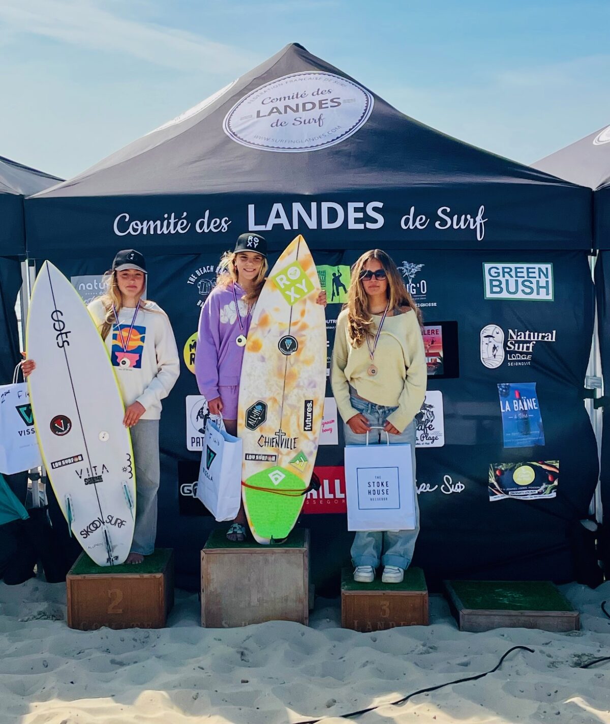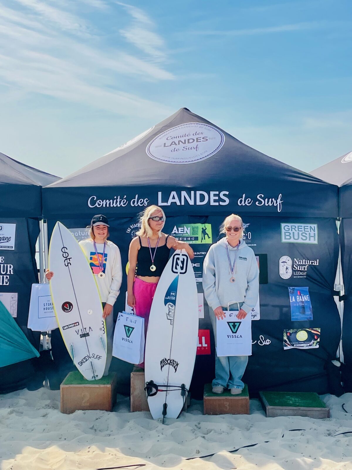 Chez les Filles personne en U14 !!! En U16 Lou Surfou raffle persque tout car c’est Charlie LEGUAY qui s’impose devant Carla MENDEZ ACEBO. Amélie STREET la locale de Lou Bisca finira 3ème devant Mahaut PETRY également de Lou Surfou. En U18 Margo LIETS du Hossegor Surf Club s’impose devant Carla MENDEZ ACEBO Lani CLEMENTS et Flo DAANS de MIMIZAN. Les podiums ci dessous.